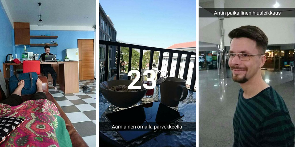Iso rooli on varmasti myös ystäväverkostollamme paikanpäällä, heistä osan tunsimme ennestään ja osaan tutustuimme vasta täällä. Seuraa siis löytyy varmasti sekä työntekoon että illanviettoihin. SariKoo ja Tom olivat olleet täällä jo useamman kuukauden ja saimme heiltä paljon hyviä vinkkejä. He harmi kyllä lähtivät Suomen suuntaan jo muutama päivä meidän saapumisemme jälkeen, mutta bonuksena saimme heiltä kaikenlaista tarpeellista kuten blenderin ja kahvinkeittimen. Ja onneksi meille jäi tänne vielä muitakin kavereita! Eiköhän tässä myös pian tutustu vielä moniin muihinkin nomadeihin, sen verran paljon meitä täällä Nimmanin alueen katukuvassa näkyy. Tuntuu siltä, että joka kahvilassa on ainakin yksi länsimaalaisen näköinen heppu läppärin taakse hautautuneena.